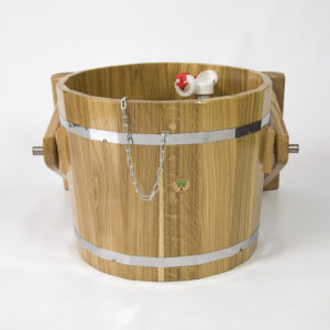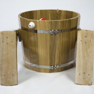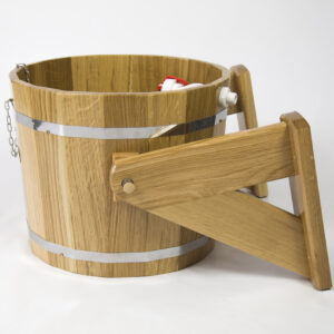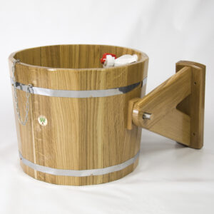 Обливное устройство изготовлено из дуба. Поверхность обливного устройства обработана специальным, особым защитным покрытием из полиуретана – придающий поверхности устройства– водостойкость – износостойкость, обладающим эластичностью. На ощупь – поверхность обливного устройства имеет приятную гладкую текстуру. Такая защита является абсолютно экологически безопасной что подтверждено государственным гигиеническим сертификатом.