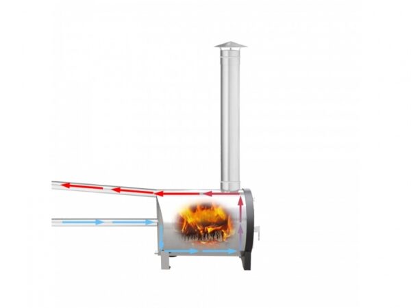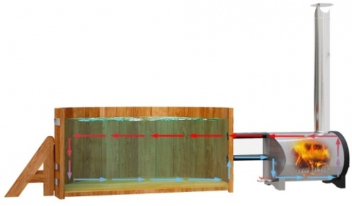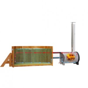 Наружная печь для купели «LIBESPA» спроектирована специально для уличных купелей. Она эффективно нагревает воду, благодаря уникальной конструкции теплообмена. Наружная печь для купели «Libespa» обладает двойными стенками и внутренними «рубашками» теплообмена в количестве трех штук, между которыми циркулирует вода, которая нагревается за счет процесса горения в топке и за счет исходящих газов, которые нагревают специальные вертикальные трубы теплообмена в количестве шести штук внутри корпуса печи. Циркуляция воды между печью и купелью происходит естественным способом по шлангам, без применения насосов. Выгодной особенностью наружной печи для купели «Libespa» является ее наружное расположение, что экономит место внутри купели, а также удобство эксплуатации печи: закладка дров, очистка печи.