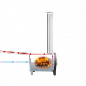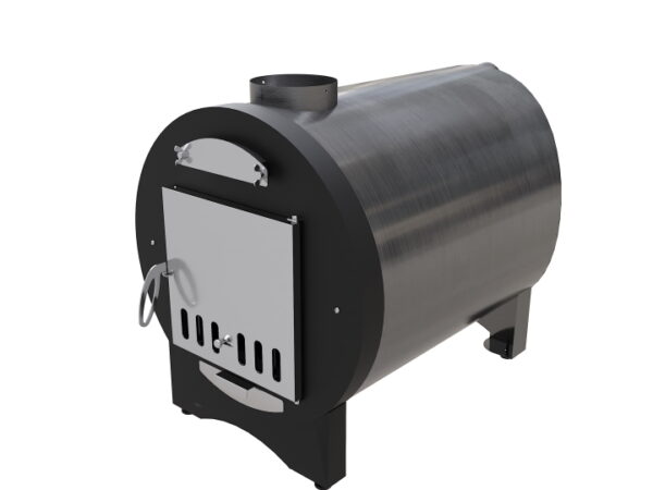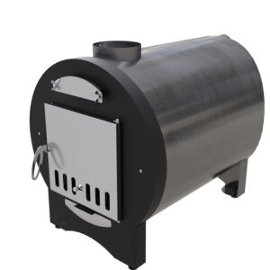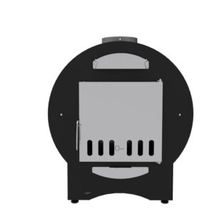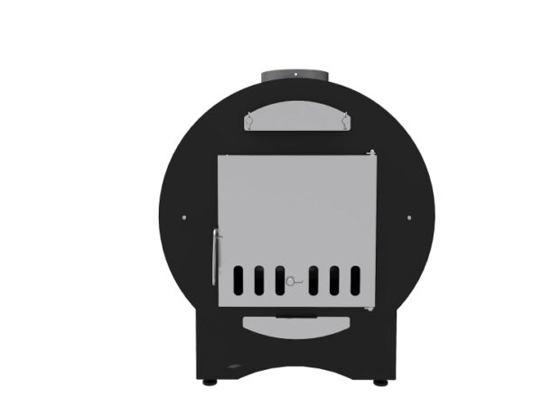 Передняя стенка и дверца выполнены из нержавеющей стали и покрыты профессиональным термостойким покрытием. Передняя стенка оснащена утеплителем из негорючей базальтовой ваты с целью повышения КПД, сохранения тепла, а также во избежание излишнего нагрева и ожогов. Дверца оснащена накладкой из зеркальной нержавеющей стали.
