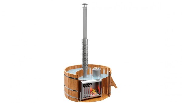 – мощность печи. Конструкция печи «LibeSpa» позволяет загрузить значительное количество дров, чтобы не подбрасывать их постоянно с целью поддержания температуры горения. Корпус печи спроектирован так, что площадь теплообмена максимально большая, включая дополнительные горизонтальные и угловые трубы внутри корпуса. Высокая температура горения и быстрый нагрев воды в купели достигаются благодаря конструкции корпуса и большого диаметра дымоходной трубы (140 мм). Следует понимать, что печи для купели, как правило комплектуются высотой дымохода не более 2-х метров, в отличие от домашних отопительных котлов, где высота дымохода может достигать 10 метров и его окончание располагается на крыше, где ничто не мешает тяге, и в данных условиях, когда высота дымохода у печи для купели не может быть длинной как в бытовых котлах, в виду объективных причин, обязательно конструировать печь таким образом, чтобы диаметр дымохода был не менее 130 мм, а лучше больше, как реализовано в печи для купелей «LibeSpa».